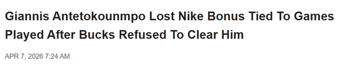 北京时间4月8日,名记Shams报道称,据多位消息人士透露,密尔沃基雄鹿在赛季末决定不让字母哥出场,让他在场外也遭受了重大经济损失。雄鹿让这位招牌球星休战的决定,直接导致他没能拿到耐克代言合同里一笔大额奖金——该条款要求他本赛季至少出战41场。