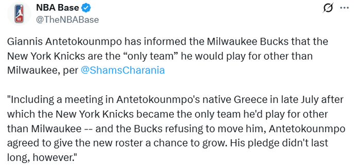 Shams还报道称,字母哥已告知雄鹿:除雄鹿外,他只为纽约尼克斯效力。“去年7月底,双方在字母哥的家乡希腊会面后,字母哥就明确——除雄鹿外,尼克斯是他唯一愿意效力的球队。尽管如此,雄鹿仍拒绝交易他,字母哥才同意给新阵容一次磨合机会。然而,这份承诺并没有维持多久。”